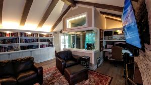First, finding a builder willing to take on something totally new, but on a smaller scale than a whole home build, isn’t an easy task. Many of the great builders/contractors I’ve used over the years have become too busy on large/big budget projects to take on something like this. Engineering the shape of the room and a way to support such a large glass opening was a bit tough and require collaboration with the builder, George Beavers. While I have visions and ideas for designs, it’s often the builder who is left to solve the problems of exactly how to build something. I was also concerned about the acoustics of the space, how it would work out with so much glass.